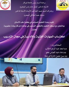 حول المهارات الفنية والإدارية في مجال التدريب برعاية كريمة من السيد رئيس جامعة ذي قار، الأستاذ الدكتور كمال ياسر المحترم، وبإشراف السيد عميد كلية طب الأسنان، الأستاذ الدكتور مشتاق نعمه المحترم، أقامت وحدة التعليم المستمر في كلية طب الأسنان ورشة عمل بعنوان “المهارات الفنية والإدارية في مجال التدريب” أقامت وحدة التعليم المستمر في كلية طب الأسنان ورشة عمل علمية بعنوان “المهارات الفنية والادراية في مجال التدريب”، اليوم الثلاثاء الموافق 2025/10/7في تمام الساعة 10صباحاً وعلى قاعة ابن سينا.يحاضر في هذه الورشة نخبة من الأكاديميين وهم: