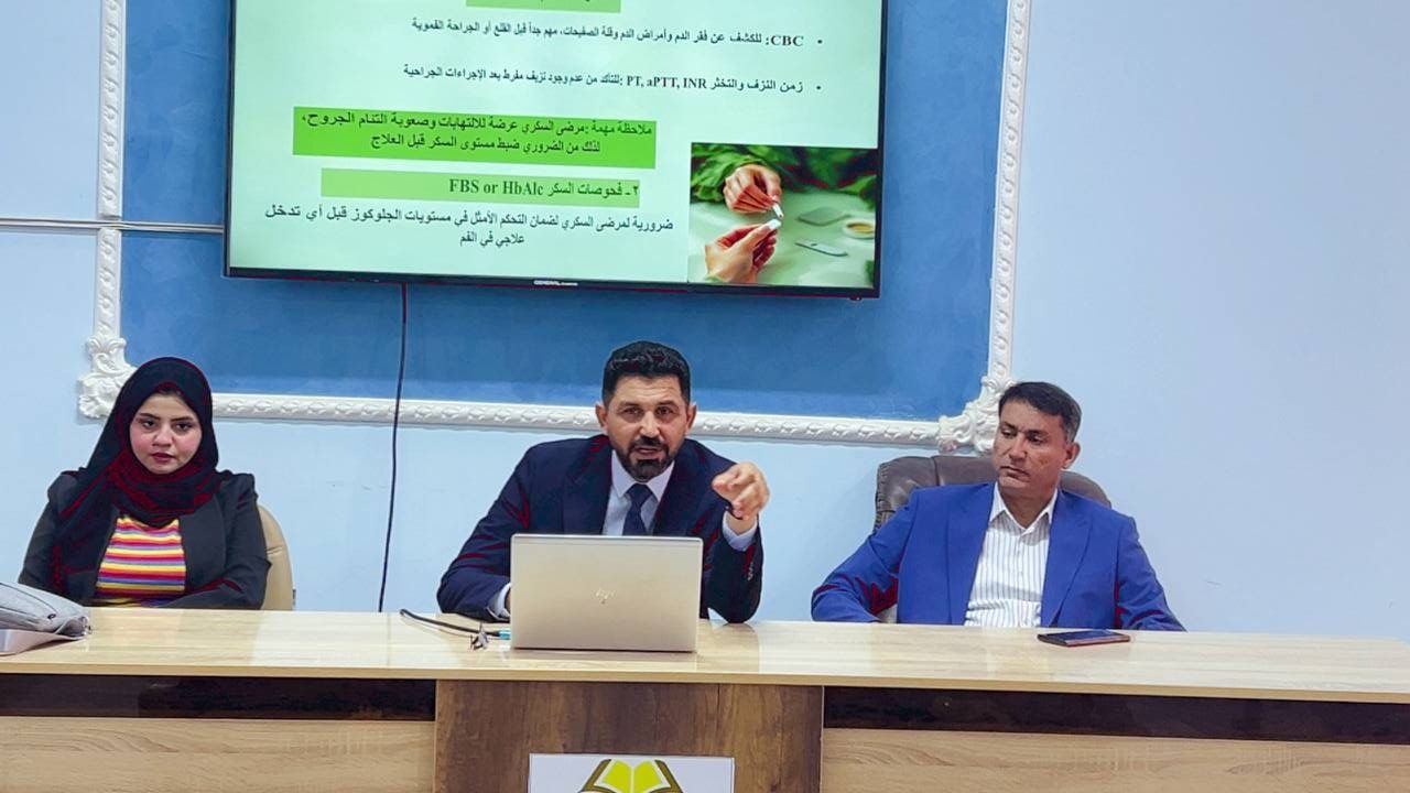 عُقدت الورشة صباح يوم الثلاثاء الموافق 7/10/2025 في تمام الساعة الحادية عشرة صباحًا في قاعة ابن سينا، تحت عنوان: (الفحوصات المخبرية لمراجعي عيادات الأسنان وطرق تجنب العدوى).